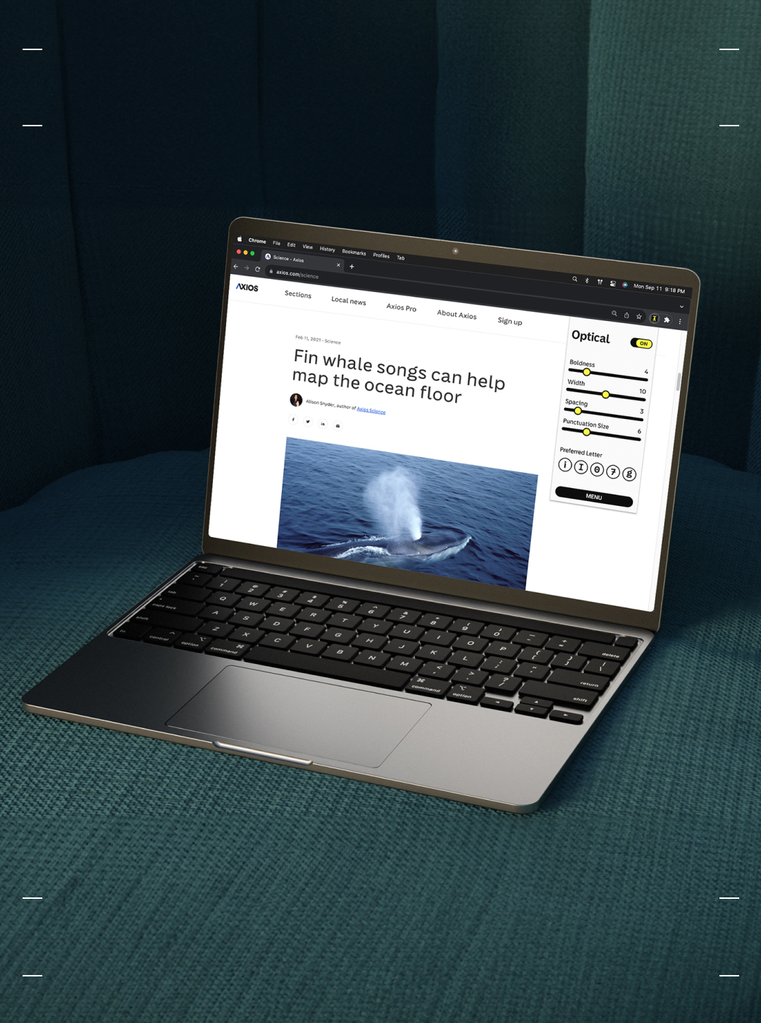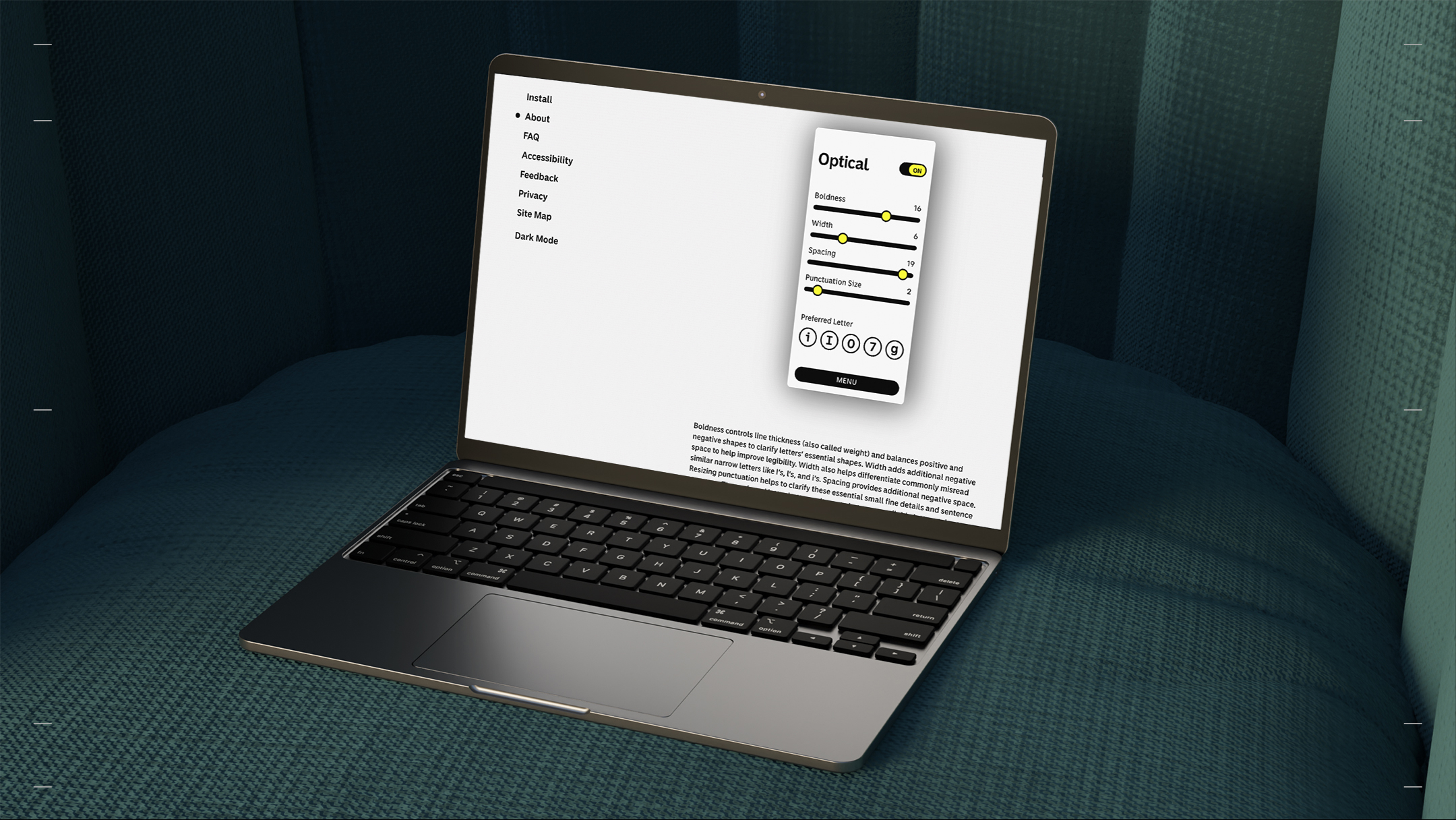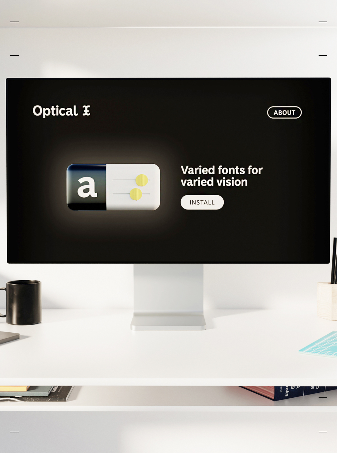 Optical is a font family and browser extension that tailors letters to varied low vision. Reading is not a trivial task. Two hundred and sixty million rods and cones in your eyes detect light and relay electrical signals to the language centres in your brain for identification and interpretation. We depend on the written word to stay informed, connected, and employed, but we haven’t perfected it. Our alphabet was created for paper, for the general population. It works well. It doesn’t work perfectly for everyone. Research suggests ways to improve letters for low vision. But low vision varies by source and degree. There are no one size fits all solutions in accessibility. Optical uses the variable font format to improve legibility for a broad range of vision.